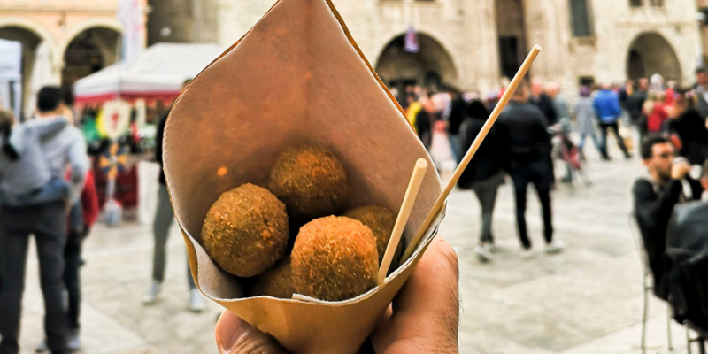 Ascoli Piceno. Explore el centro de Ascoli, una aglomeración virgen de edificios medievales, renacentistas y barrocos alrededor de plazas porticadas y calles estrechas. El paseo termina en un productor de la delicada aceituna ascolane: aceitunas verdes dulces y jugosas rellenas de carne aromatizada y fritas en pan rallado. Mira cómo se hacen y pruébalos aquí. Aperitivo por la noche en un café histórico en la Piazza del Popolo, la sede en el centro de la ciudad de una destilería familiar de anisetta.