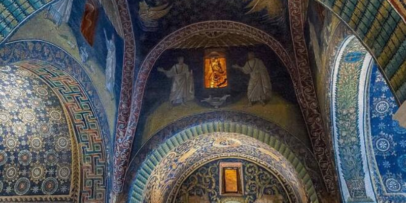 Una serie de esos bolsillos se reunieron alrededor del extremo norte del Adriático y el noreste de Italia, el último reducto del Imperio en Occidente. Criada en un retiro imperial, Ravenna permanece anclada en las marismas del Adriático, humillada por el ascenso de sus grandes vecinos, Bolonia y Venecia, y sin obstáculos por el comercio político posterior. El efecto de este estado marginal ha sido salvar sus edificios paleocristianos y dejar una herencia bizantina de variedad y riqueza únicas. Dada la intensidad con la que se desarrolló Rávena entre 402, cuando Honorio la eligió su capital, y 751, cuando el último de los exarcas regresó a Constantinopla, es una introducción adecuada a la cultura paleocristiana y medieval temprana en el noreste de Italia.