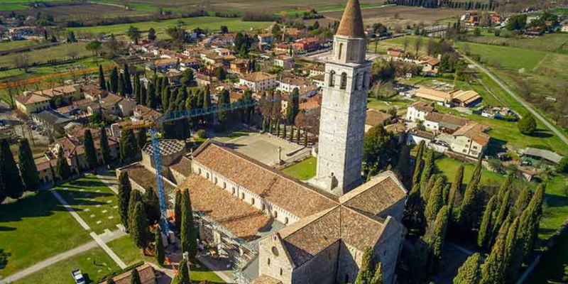 Aquileia, Grado. Aquileia era una importante ciudad romana cuya influyente catedral se completó en 319. Se conservaron secciones de muros y pavimentos de mosaico dentro de la actual catedral del siglo XI, una supervivencia bastante maravillosa. El saqueo de Longobardo de 568 resultó en el traslado de la sede a la posición más defendible en la costa de Grado, cuyas dos grandes iglesias del siglo VI, Sta. Maria della Grazie y la catedral, también tienen mosaicos sobresalientes en el piso.