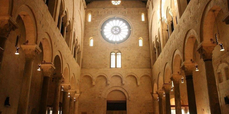 Bari, Trani. Bari, capital de Puglia, tiene un barrio medieval extenso y virgen junto al mar. La Basílica de S. Nicola, iniciada en 1087, no solo es la primera sino también la más grande de las iglesias románicas de Puglia; el trono episcopal aquí es notable. Visitamos también la catedral (1170) y más tarde el castillo medieval angevino. De vuelta a Trani no podemos olvidar visitar la catedral románica mágicamente hermosa en el paseo marítimo.