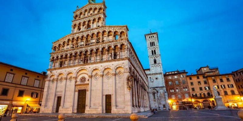 A diferencia de muchas ciudades toscanas, Lucca se encuentra en el fondo del valle. Esta característica y las huellas del patrón de calles en forma de cuadrícula, aunque con una inflexión medieval, delatan su origen romano. Dentro de las murallas, la ciudad es un convincente documento de mampostería de la Edad Media. Hay una magnífica colección de iglesias románicas con el rasgo distintivo de hileras de arcadas aplicadas a las fachadas. También hay una buena escultura, incluida la exquisita tumba de Ilaria del Carretto, y algunas pinturas de paneles bastante excepcionales (y excepcionalmente tempranas). Sobre la densa red de calles estrechas se ciernen los imponentes palacios de la élite mercantil, incluidos algunos grandiosos de la época barroca.