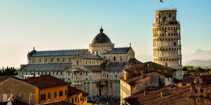 Pisa. En la Alta Edad Media, Pisa era una de las ciudades-estado marítimas más poderosas del Mediterráneo, rival de Venecia y Génova, obteniendo una gran riqueza de su comercio con el Levante. El «Campo dei Miracoli» es un magnífico conjunto románico de catedral, cementerio monumental, campanario («Torre inclinada») y baptisterio, todo de mármol blanco reluciente. Entre las principales obras de arte aquí se encuentran el púlpito de Nicola Pisano (1260) y el fresco El triunfo de la muerte del siglo XIV.
